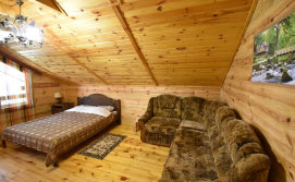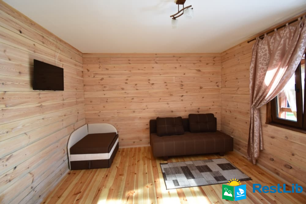 Можливе поселення меншої кількості. (Котедж У Юлії) Будинок складається з 7 номерів : 4 двомісних (двоспальне ліжко, крісло) та 3 тримісних +1 (двоспальне ліжко + диван, два номери з балконами). На першому поверсі простора вітальня з каміном, шкіряними диванами, телевізором(Екстра ТВ). Кухня на першому поверсі : повністю облаштована (техніка, посуд, кухонний гарнітур) Біля котеджу велика крита тераса з столами та лавками, настільний футбол.