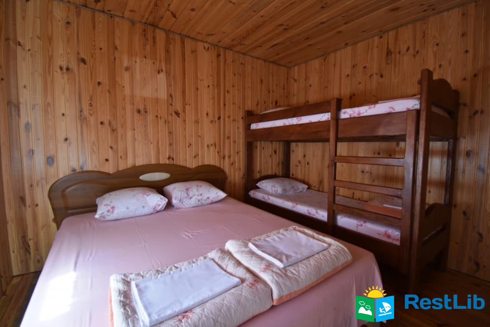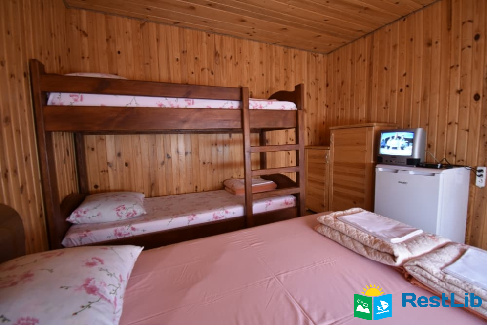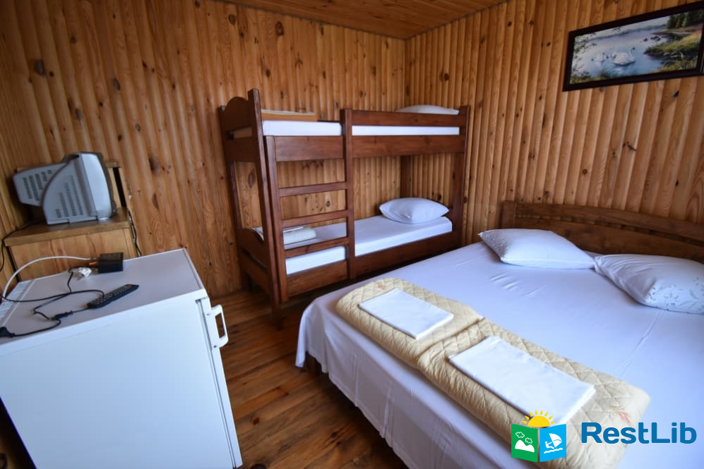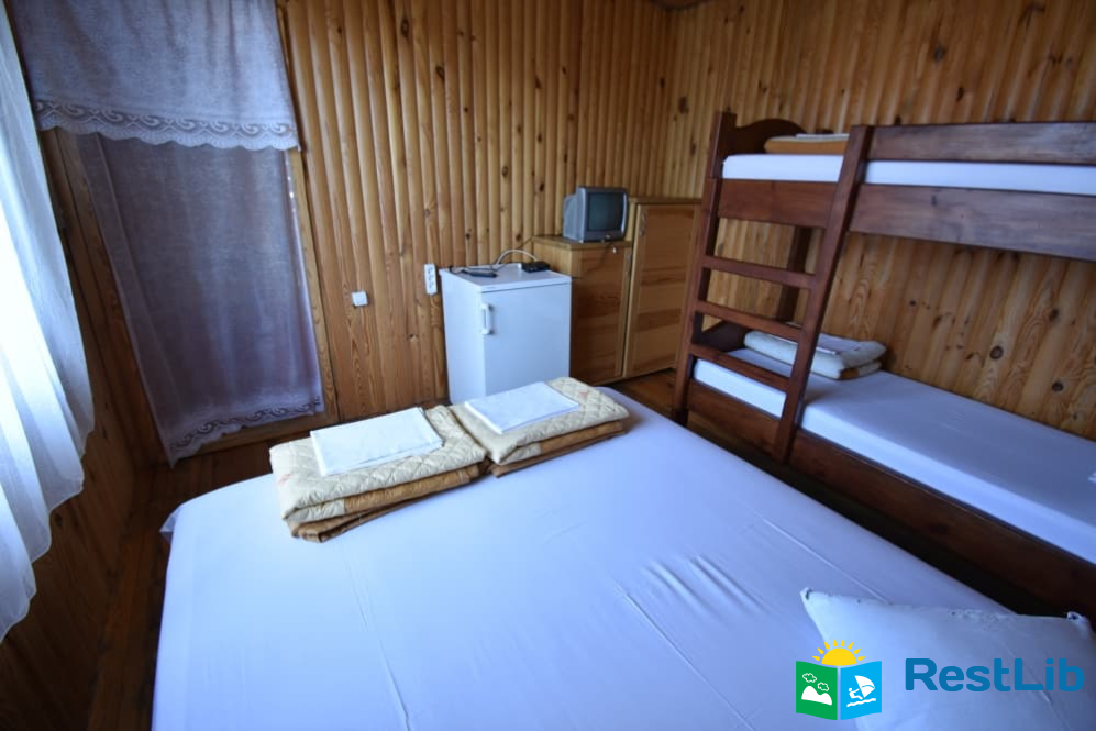 Три однокімнатні будинки розраховані на 4 людини. В кожному: перед входом крита тераса з столом та лавками, в кімнаті двоспальне + двоярусне ліжко, телевізор, холодильник, комод для речей.