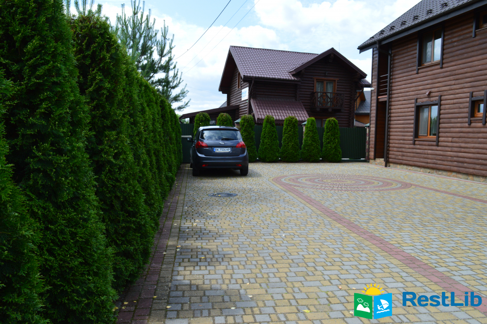 Велика територія навколо котеджу озеленна та огороджена. Поруч є магазини.
