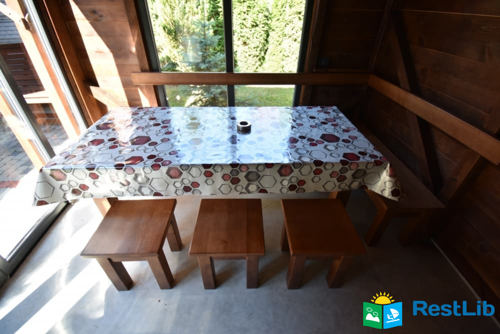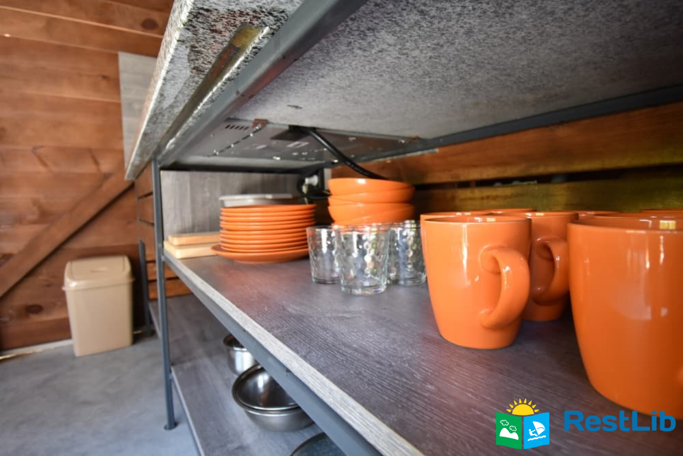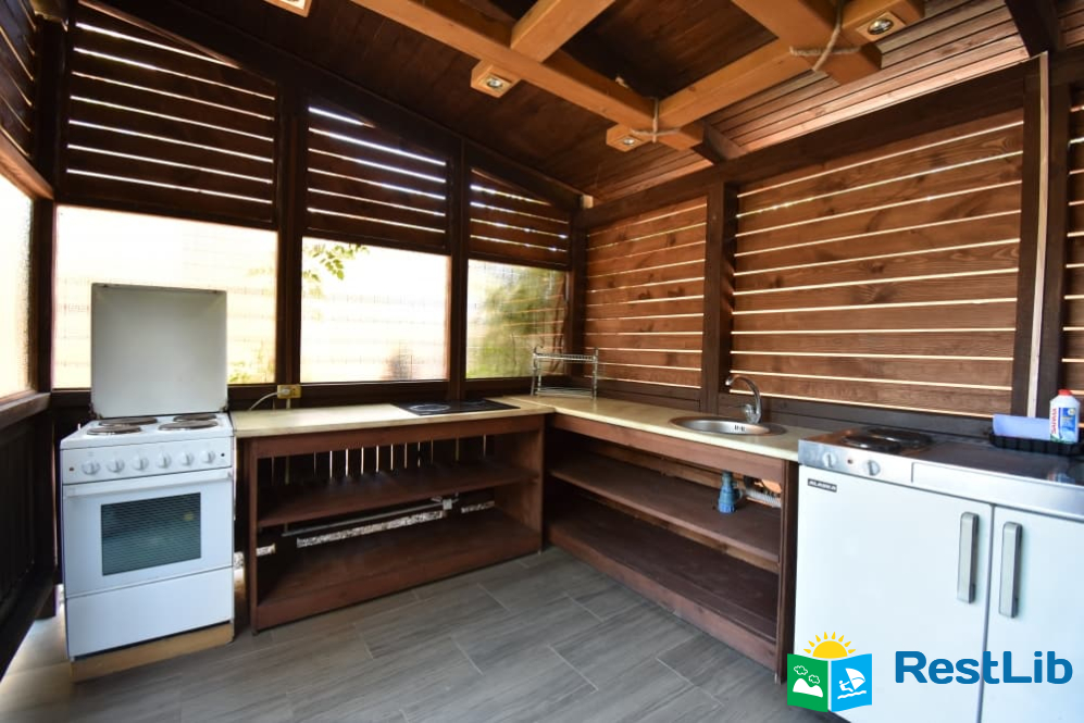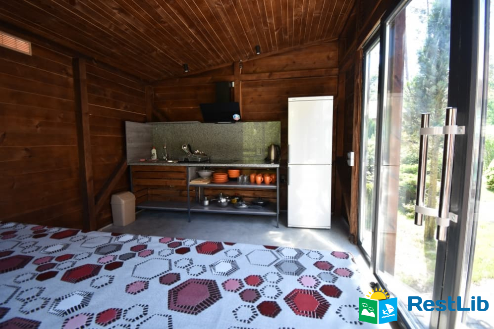 Поблизу кожного котеджу розташовані сучасні альтанки з кухнею для самостійного приготування їжі. На кухні: великий обідній стіл, холодильник, варильна електрична поверхня, витяжка, чайник, посуд.