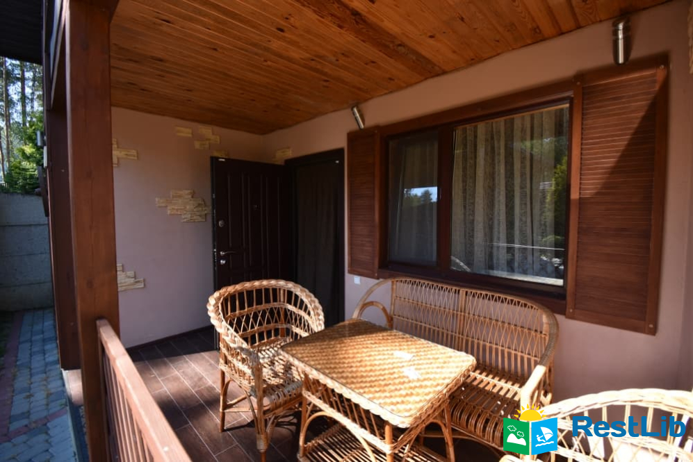 В кожен будинок вхід через криту терасу з плетеним столом та кріслами.