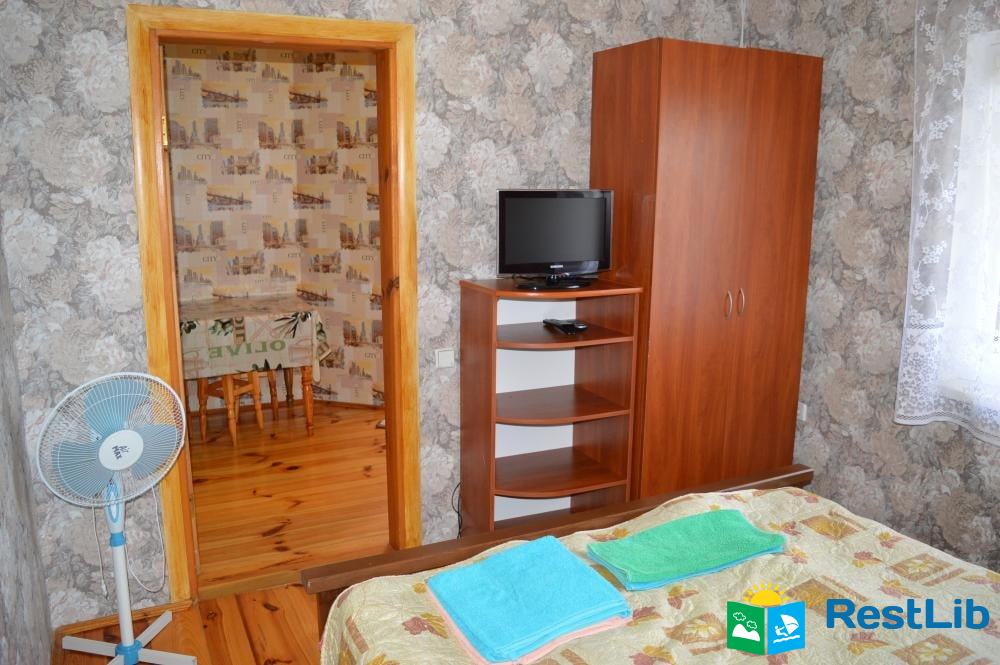 - спальна кімната з двоспальним ліжком, приліжковими тумбами, шафою, телевізором та вентилятором
