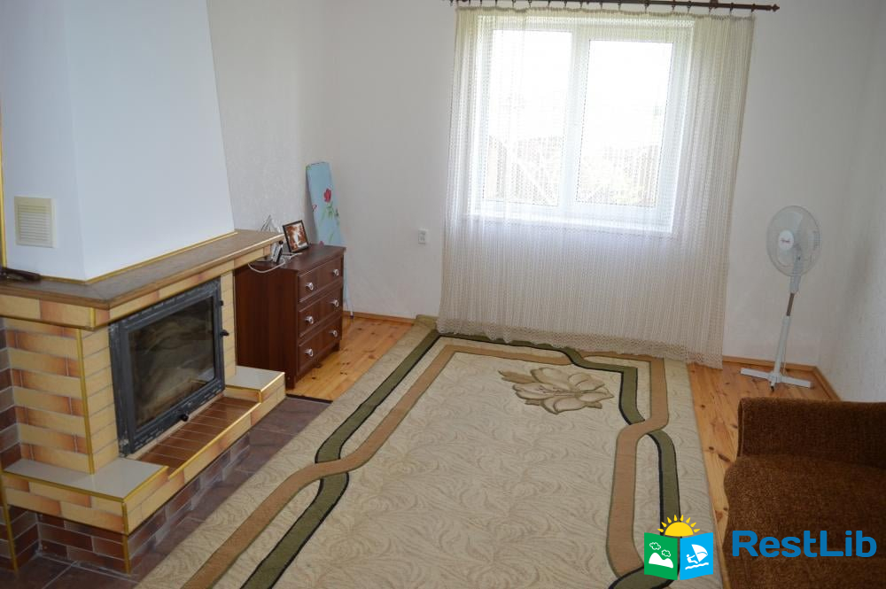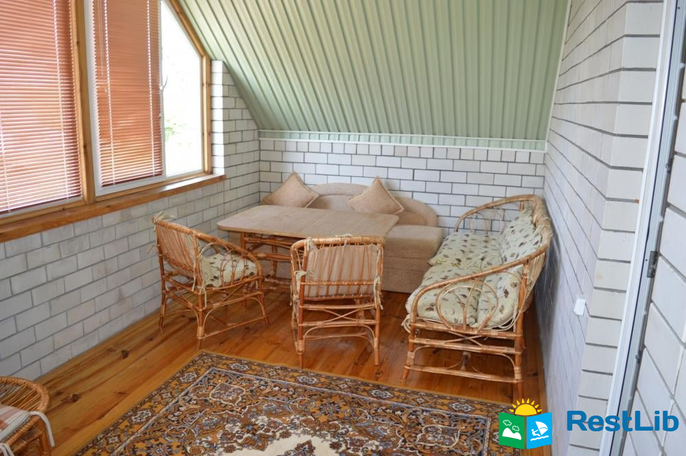 - на першому поверсі простора веранда з кріслами-качалками, столом та диванами, велика кухня-столова обладнана всім необхідним для зручного приготування їжі, санвузол та спальна кімната з розкладним диваном, комодом, каміном та вентилятором.