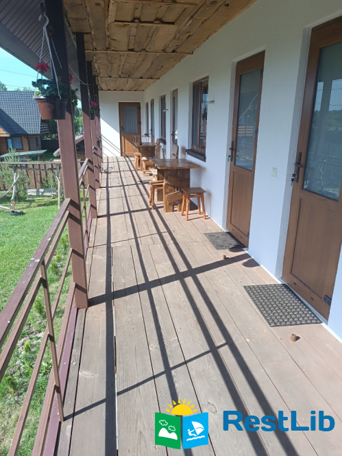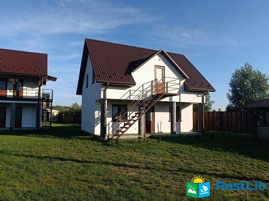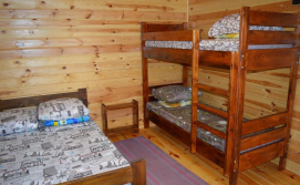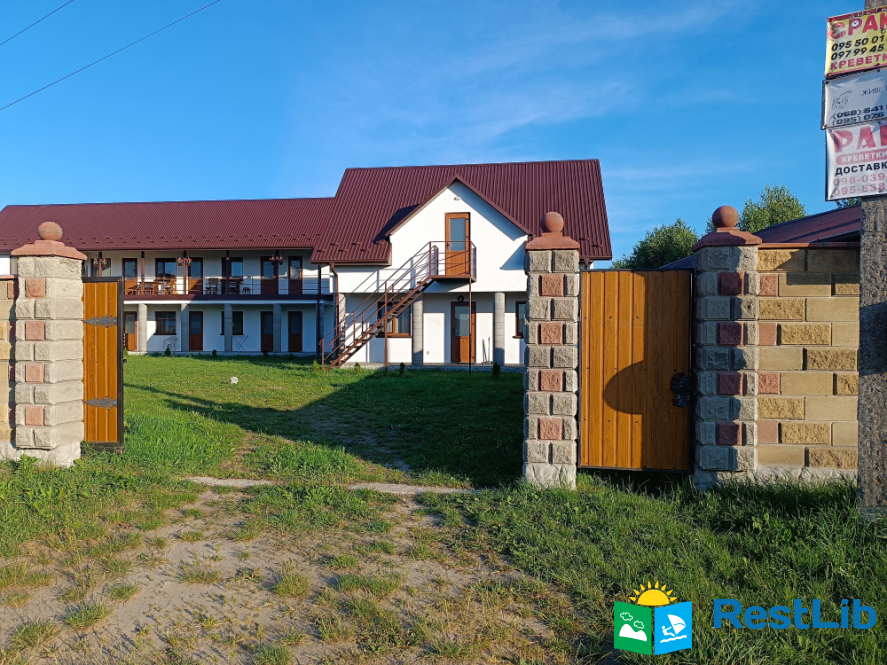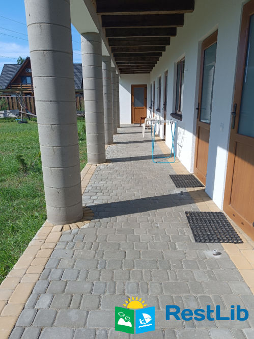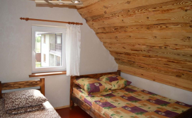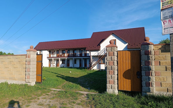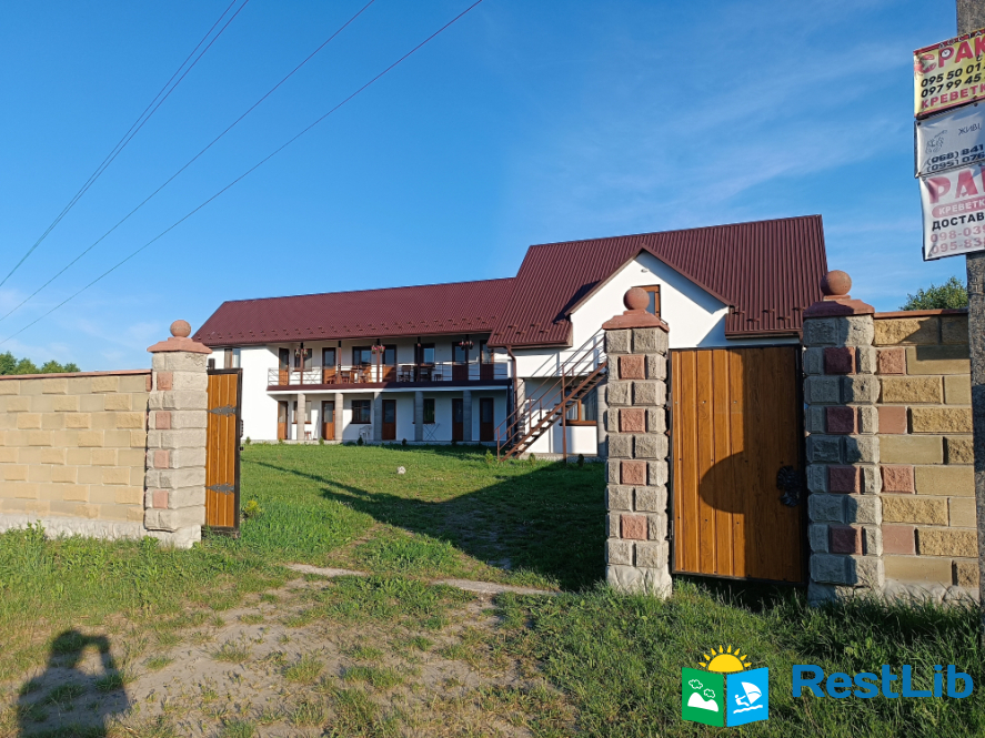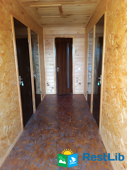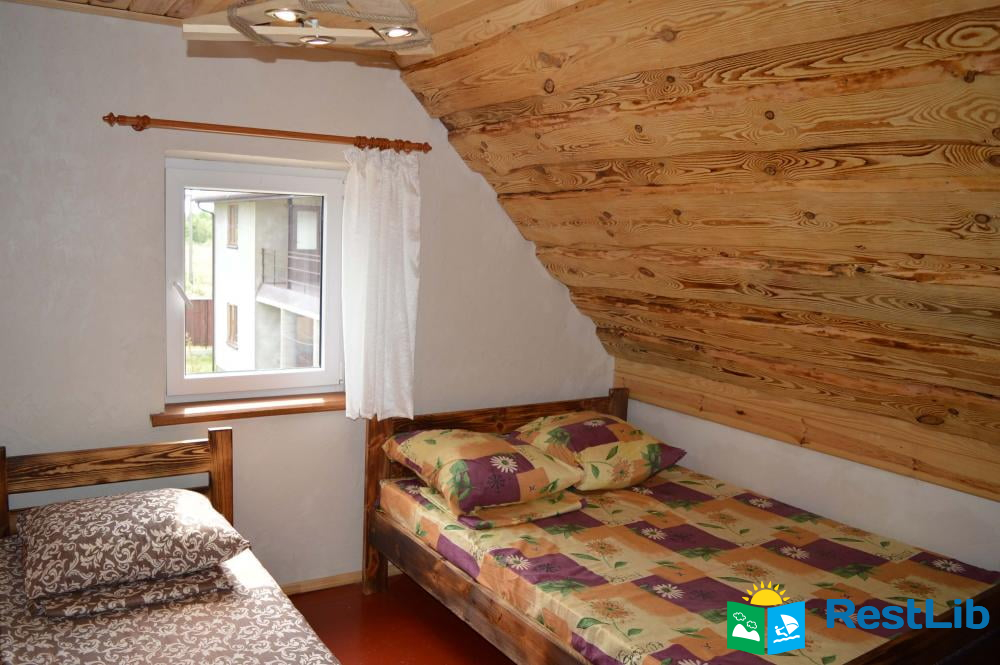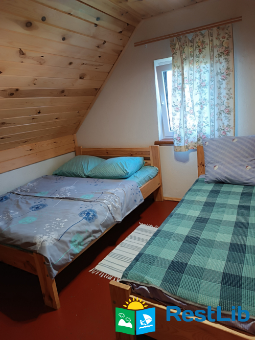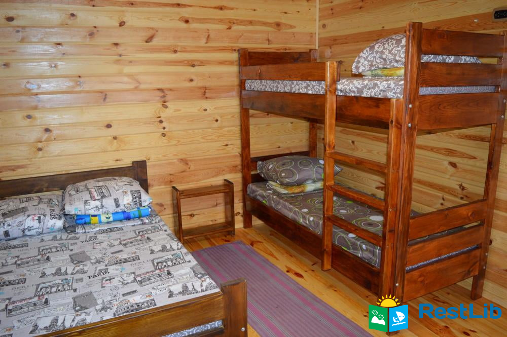 Пропонуємо 2 двоповерхові  будинки. Менший будиночок складається з чотирьох тримісних номерів на другому поверсі, на першому поверсі - чотиримісний номер і тримісний з власною кухнею. На другому поверсі спільний санвузол для чотирьох номерів, на першому - душ і санвузел. Є можливість оренди малого будиночка для компаніі на 20 чол.