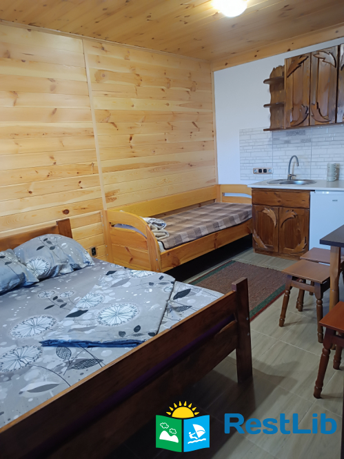 В номері двоспальне + односпальне ліжка, власна кухня, санвузол, телевізор з Т2, холодильник, електрочайник, плитка індукційна, посуд.