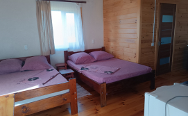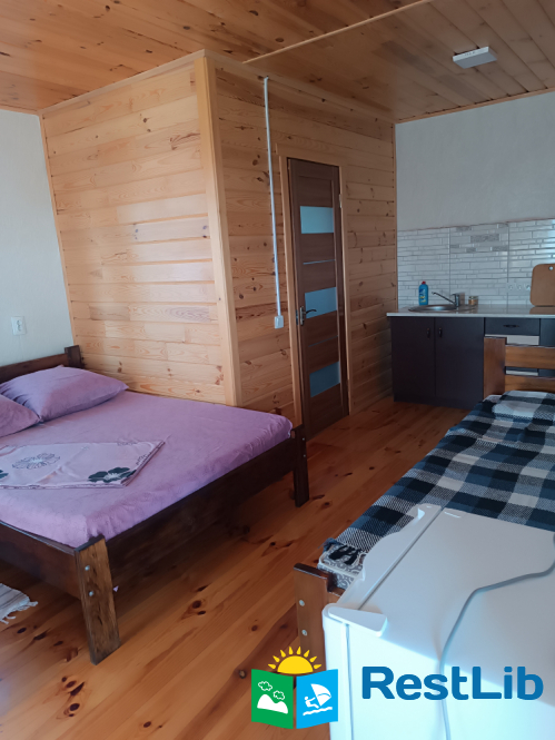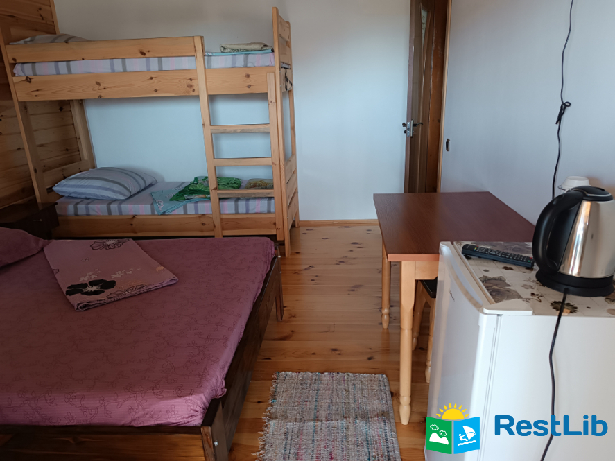 В номері: два двоспальних ліжка + одне односпальне, телевізор з Т2, санвузол, холодильник, кухня, електрична плита-духовка, посуд, чайник