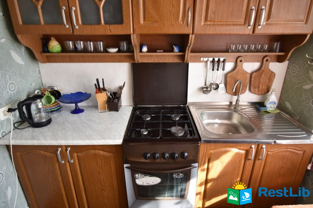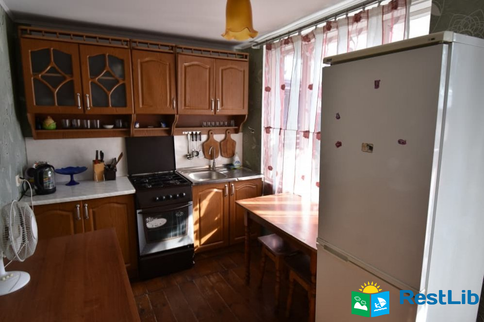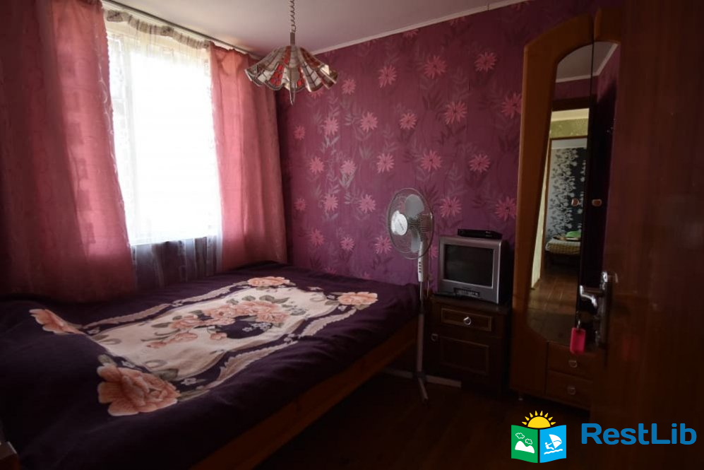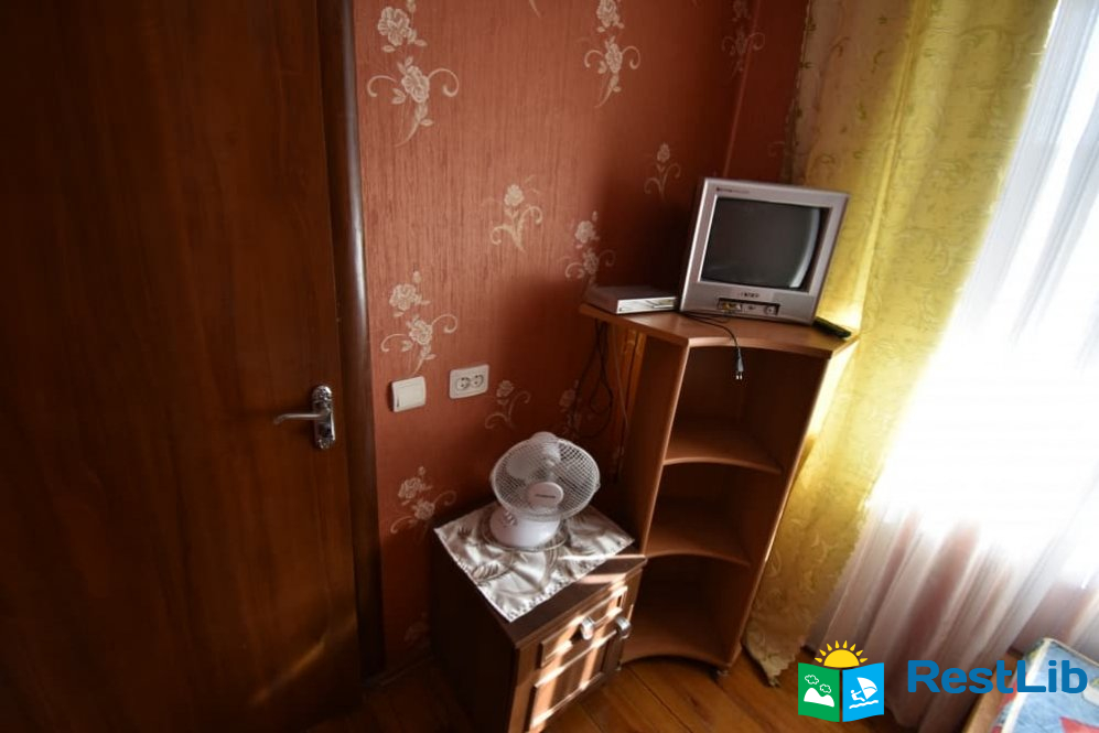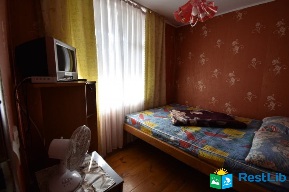 Окремий апартамент на три кімнати, з кухнею та санвузлом. В двох кімнатах двоспальні ліжка, в третій - двоспальне + односпальне. В кімнатах є шафи, тумбочки, стільці, вентилятор, телевізор. На кухні: плита, електрочайник, весь необхідний посуд.