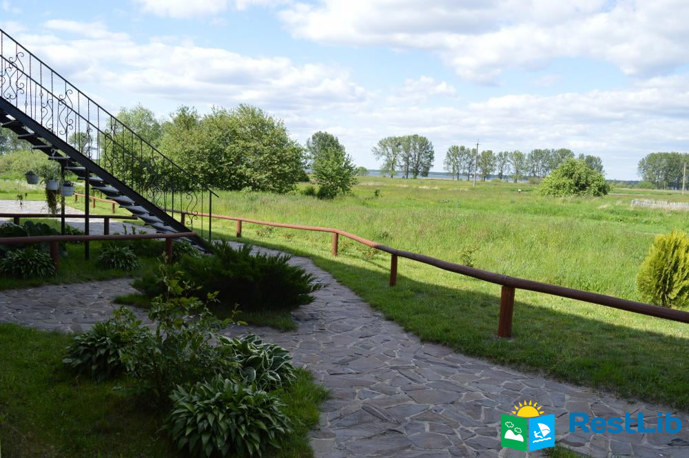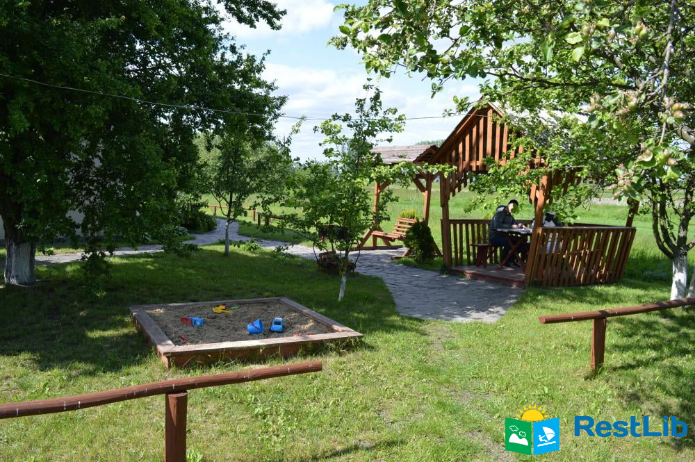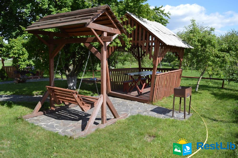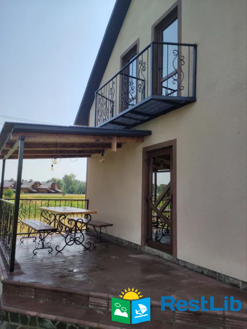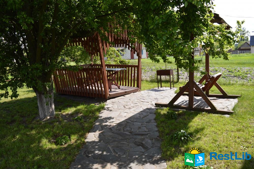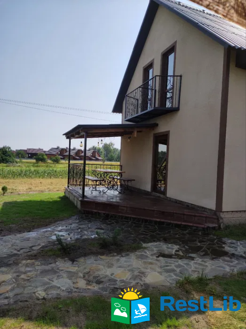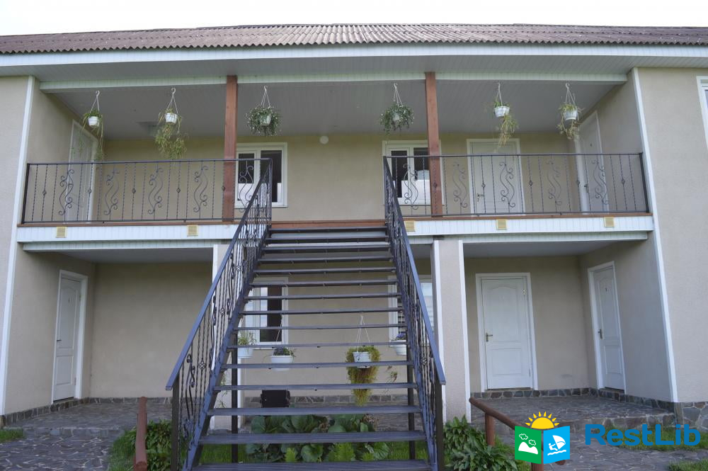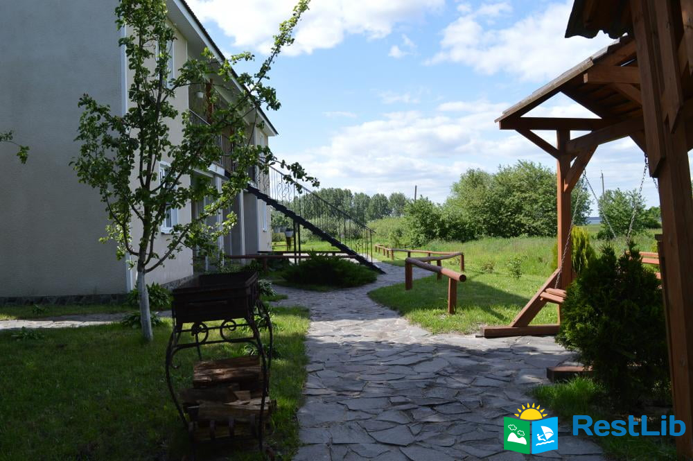 Будинок та прибудинкова територія оздоблена натуральним каменем.А на самому подвір"ї росте трава  та молоді садженці туй, також на території розкинулися квіткові клумби. Внутрішні оздоблення номеру виконано з натуральної деревини, всередині є всі зручності необхідні для комфортного відпочинку.