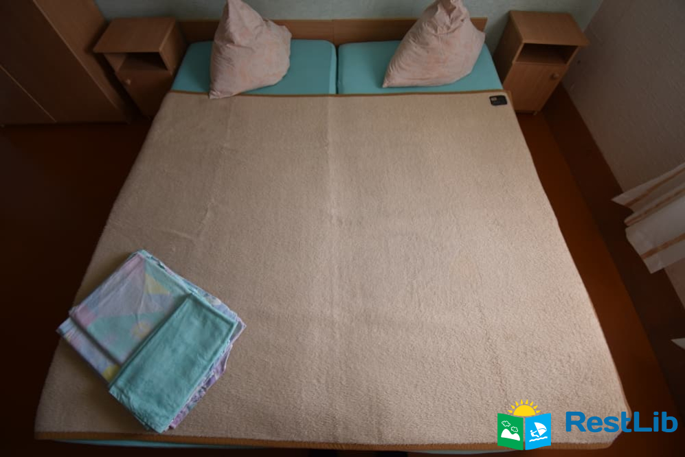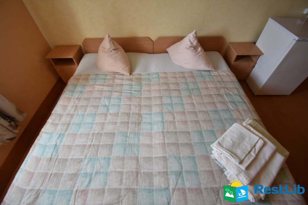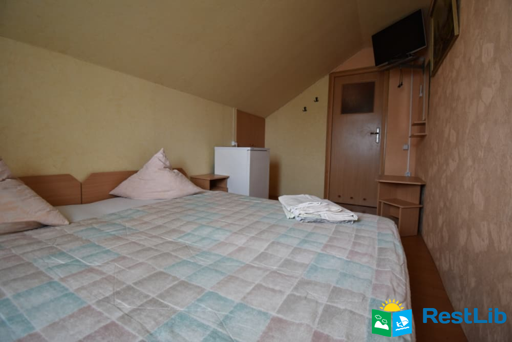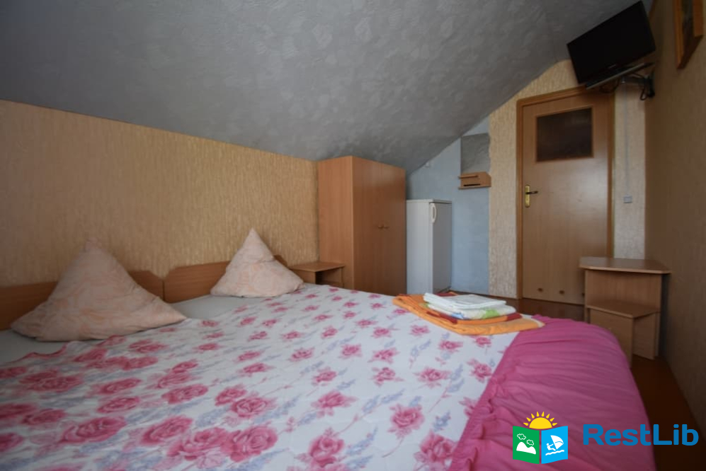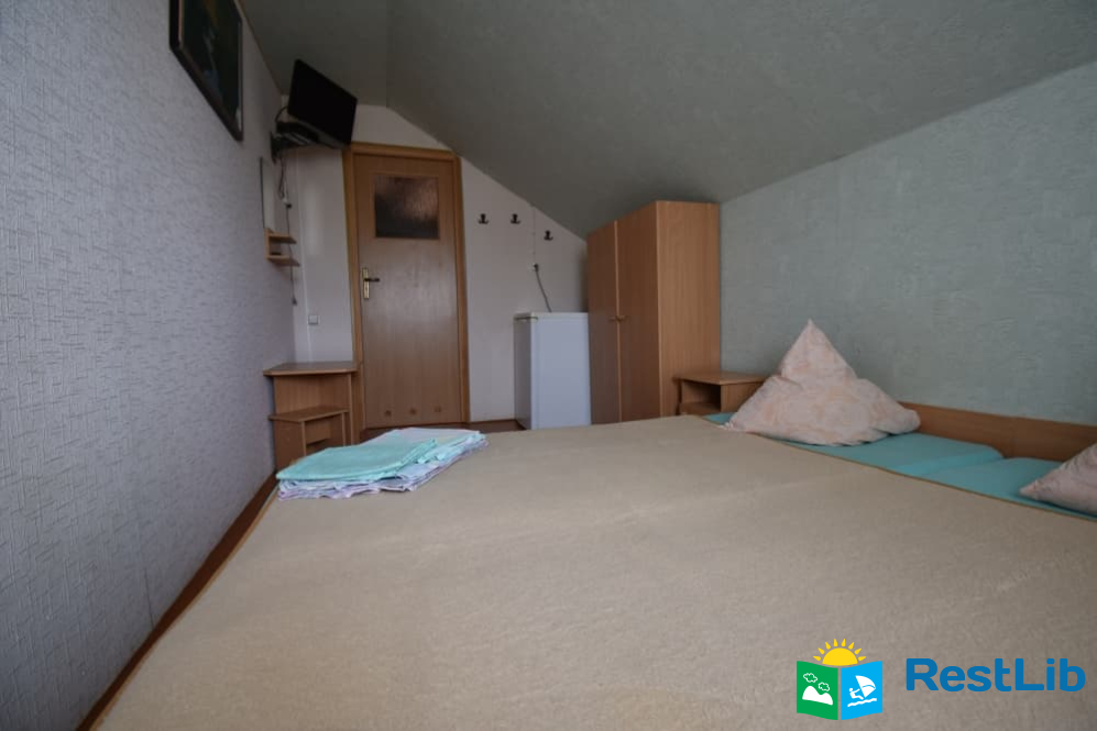 Загальна кількість номерів : 1 Перший поверх будинку 2. В номері: два двоспальних ліжка + розкладний диван, телевізор, холодильник, шафа, постільна білизна. Санвузол (душ, туалет, умивальник) -загальний на 3 кімнати з окремим входом. Кухня - загальна на 3 кімнати.