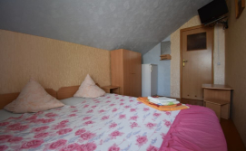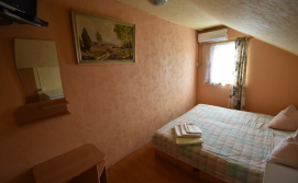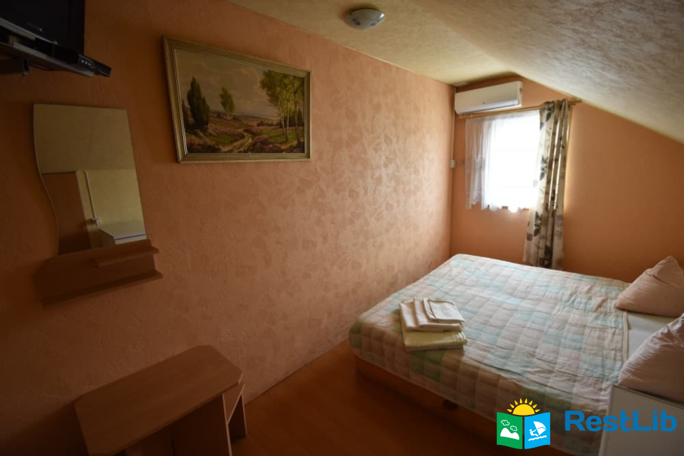 З кондиціонером Другий поверх будинку 1. В номері: двоспальне ліжко, кондиціонер, телевізор, холодильник, шафа, тумбочки, постільна білизна. Літня кухня на 4 кімнати (повністю укомплектована) Туалет на 1 поверсі, 2 душа на другому поверсі