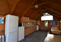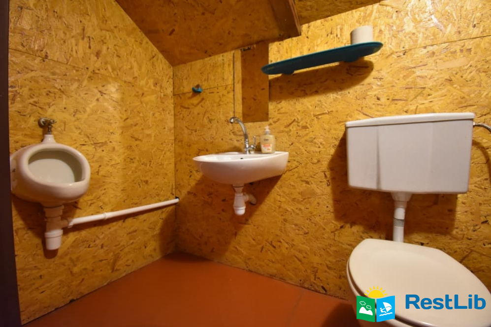 • На першому поверсі: окремий, сімейний апартамент на 4 осіб, з окремим входом з вулиці. В ньому санвузол (душ, туалет, умивальник), кухня (кухонний гарнітур, техніка, посуд). При вході тераса зі столом та лавками.