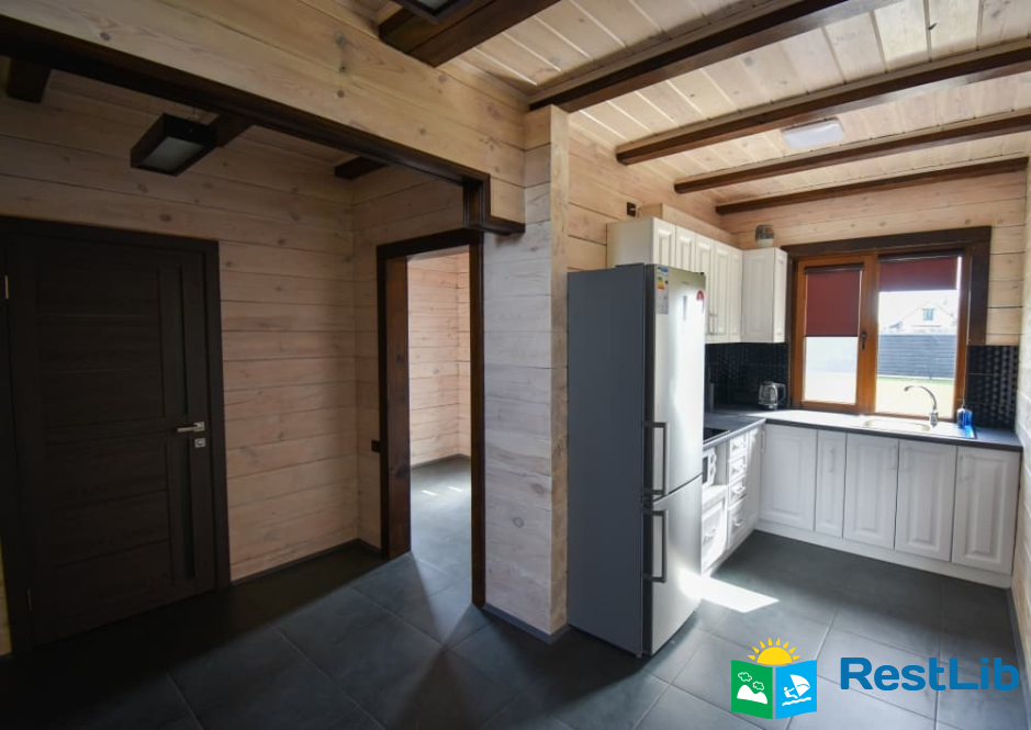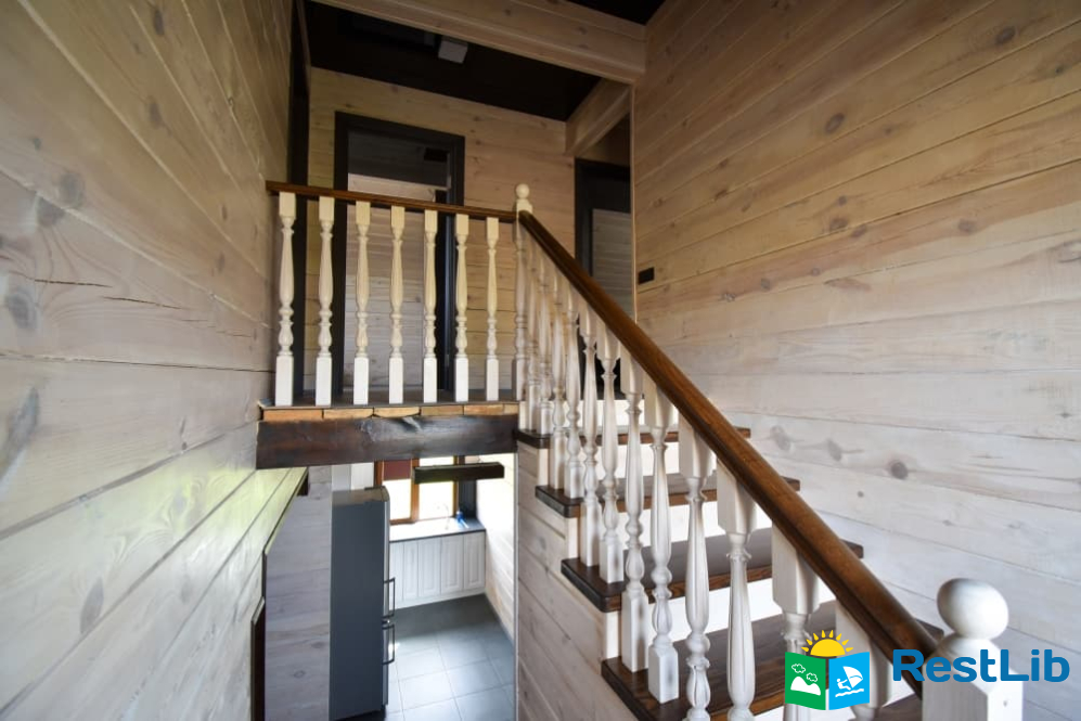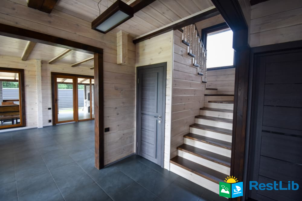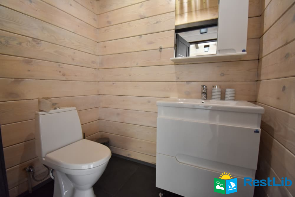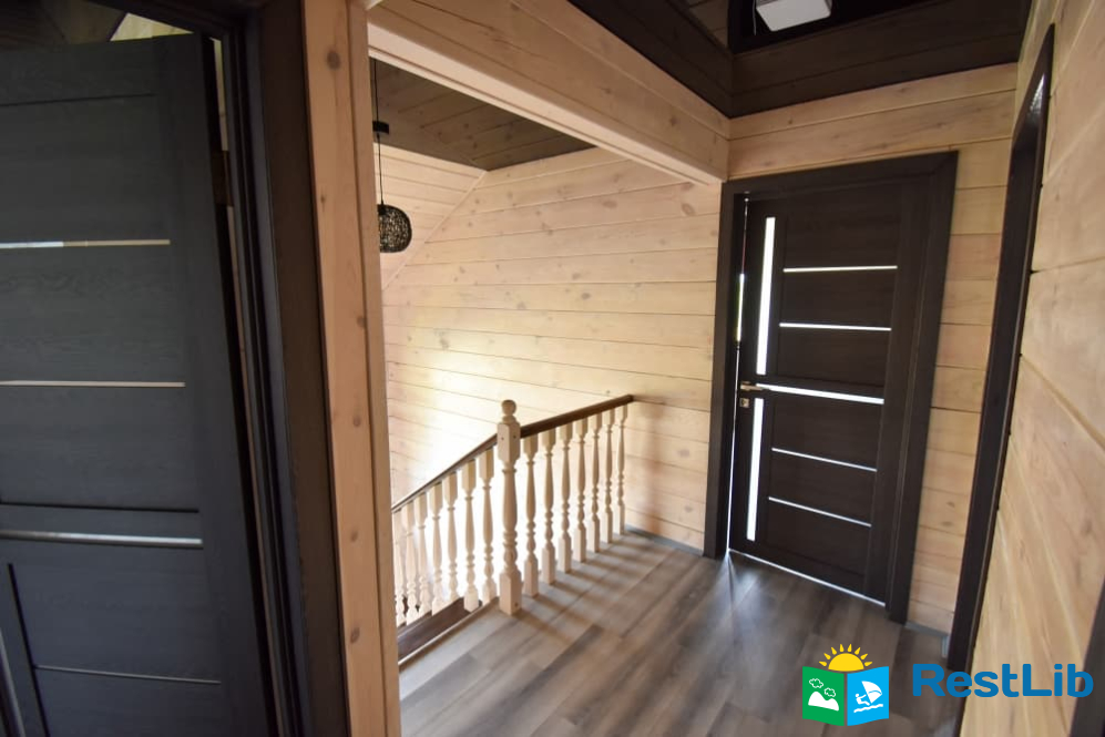 На першому поверсі знаходяться: хол (обідній стіл, ТБ, м'який куточок, кондиціонер), 2 санвузли ( В першому - душ, туалет, умивальник; В другому - туалет, умивальник), пральна машина, кухня, з усім необхідним, коридор