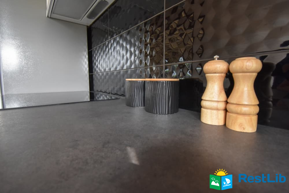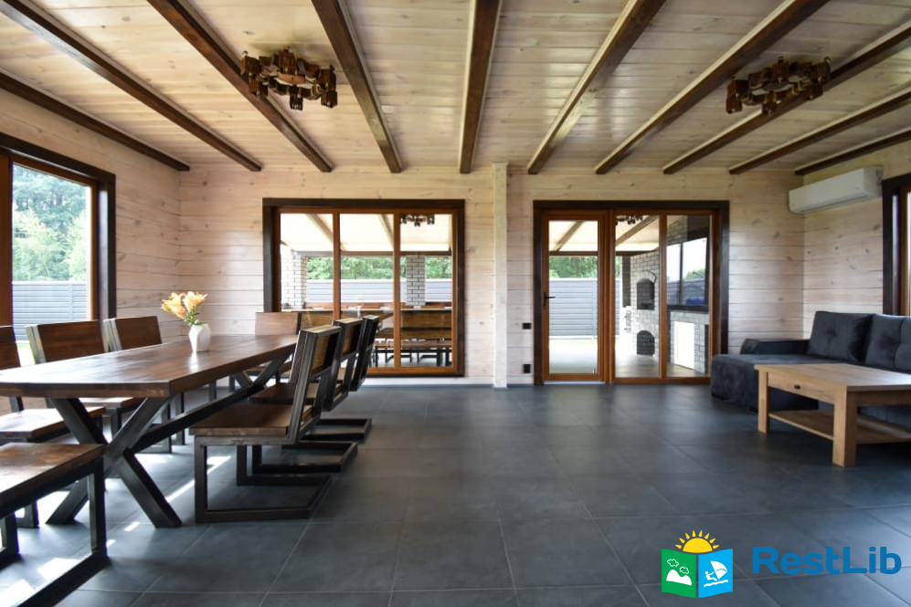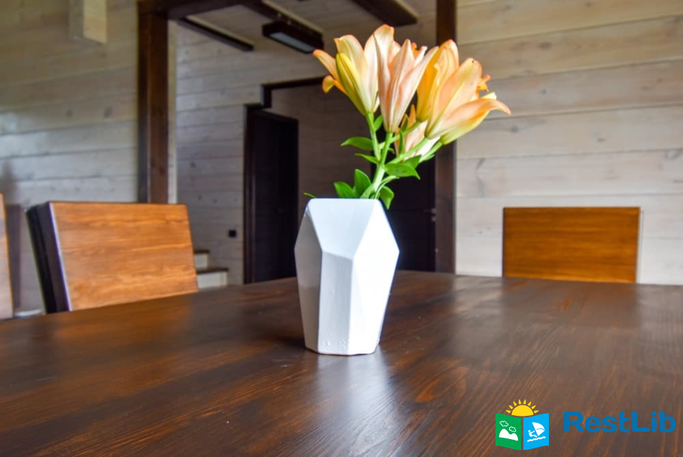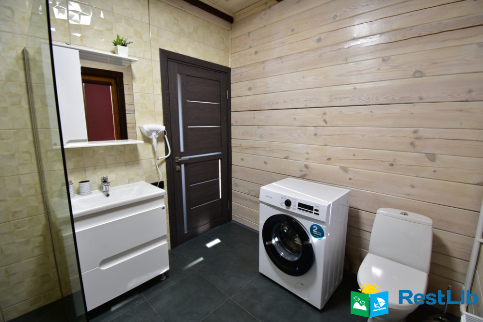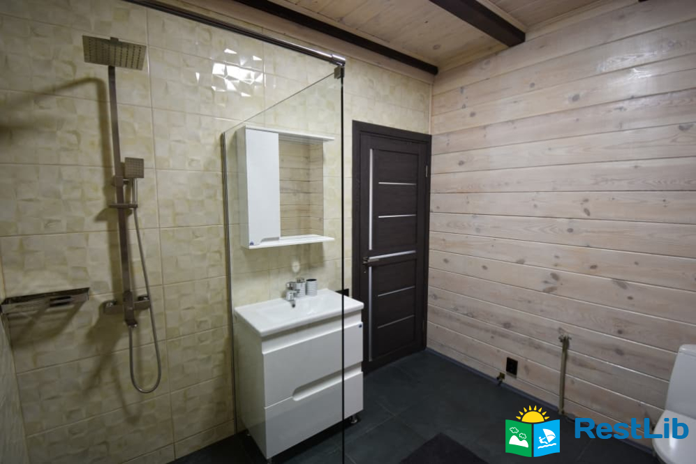 На першому поверсі знаходяться: хол (обідній стіл, ТБ, м'який куточок, кондиціонер), 2 санвузли ( В першому - душ, туалет, умивальник; В другому - туалет, умивальник), пральна машина, кухня, з усім необхідним, коридор